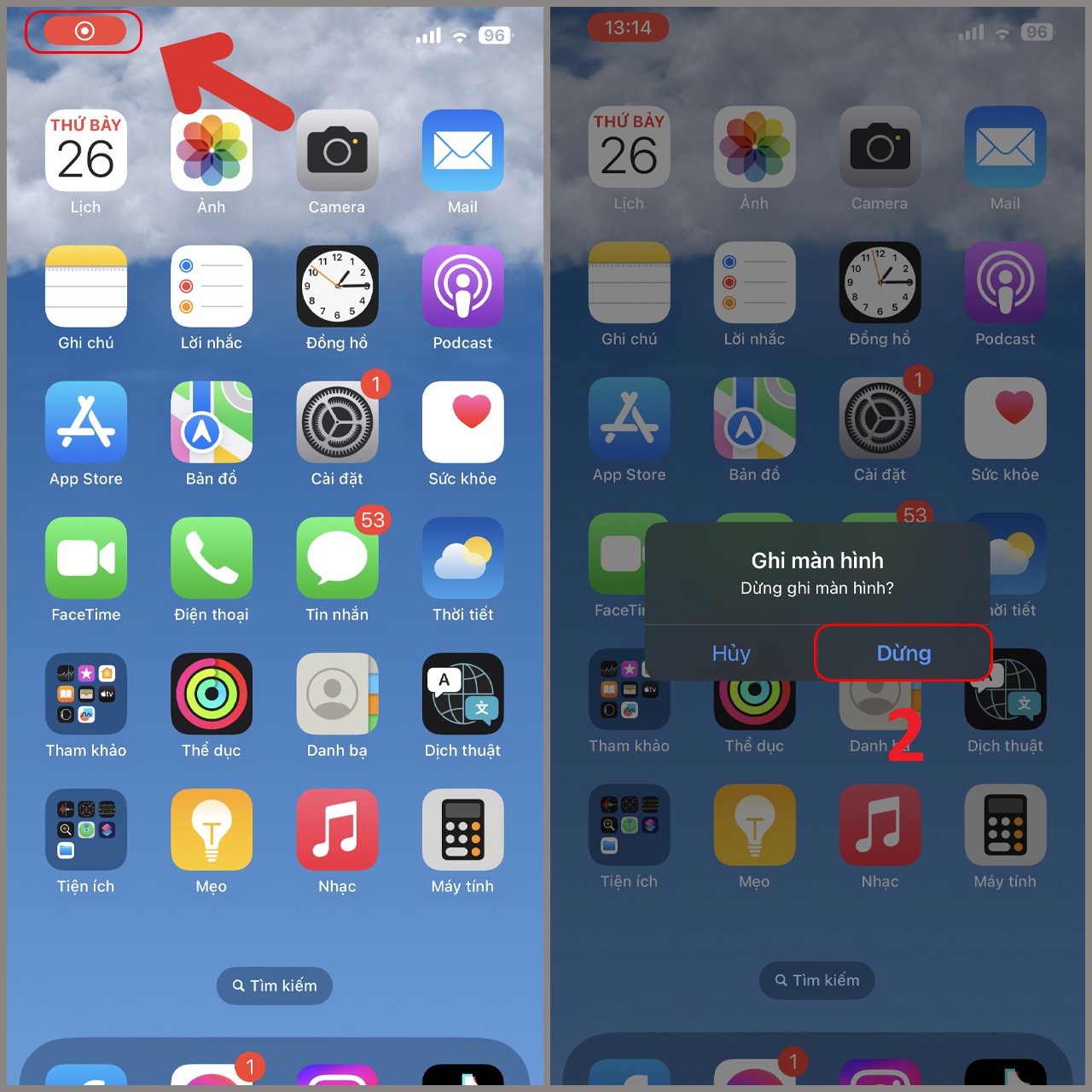 Bước 2: Nhấn vào thanh trạng thái màu đỏ ở phía trên bên trái > Chọn Dừng để dừng nhanh việc ghi màn hình.