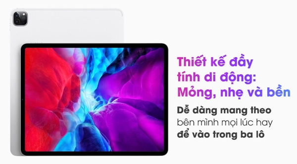 iPad Pro 12.9 inch 2020 vẫn duy trì sử dụng màn hình Liquid Retina cùng các tính năng hàng đầu như ProMotion. Cùng với tần số quét 120Hz giúp các chuyển động trở nên nhanh nhạy và chính xác hơn. Màn hình có độ phân giải 2732 x 2048 pixel, hỗ trợ không gian màu P3, TrueTone, độ sáng cao và có lớp chống chói để hiển thị tốt hơn trong nhiều điều kiện ánh sáng khác nhau. Không còn nút Home, màn hình trên iPad Pro nay được kéo tối đa ra 4 cạnh giúp cho máy có một màn hình lớn nhưng vẫn có giữ được sự nhỏ gọn.
