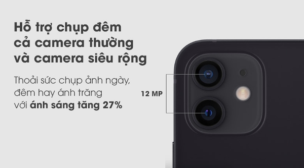 Camera iPhone 12 64GB được trang bị hệ thống 2 ống kính với độ phân giải 12MP. Thiết lập camera mới này sẽ được kế thừa và bổ sung thêm nhiều tính năng hấp dẫn mang đến khả năng chụp ảnh vượt trội cho người dùng. Không những đáp ứng tốt nhu cầu chụp ảnh, mà điện thoại hứa hẹn sẽ hỗ trợ khả năng quay video chuyên nghiệp.
