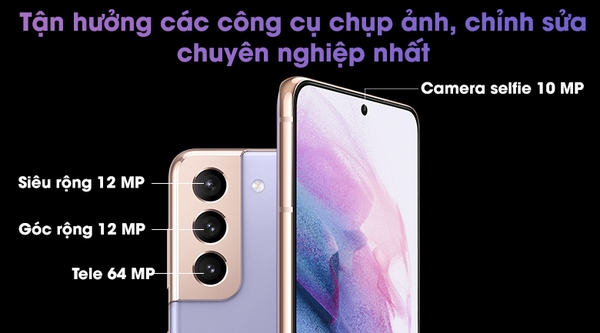 Gồm: Camera chính góc rộng 12 MP, camera góc siêu rộng 12 MP, và camera tele siêu zoom 3x 64 MP, tích hợp loạt công nghệ AI, việc của bạn là ngắm và chụp, việc của AI trên S21+ sẽ tự động điều chỉnh tất cả để tạo ra ảnh chụp chất lượng tốt nhất.
